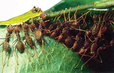 缝叶蚁在开始筑巢前,先爬上一株阔叶树,在枝头精心选择好两张完整结实的大叶片,然后由一些缝叶蚁在叶片的边缘上一字排开,在叶缘上咬出一排整齐的小孔。孔咬好后,它们又爬在叶缘上,齐心协力,用后足用力攀住自己所在的叶片,再用前足将另一片叶子使劲拉过来,使两片叶子的叶缘对合到一起。当一切准备工作就序以后,另一些缝叶蚁就从原先的蚁巢里衔出一条条会吐丝的幼虫,用挤压的办法使它们吐出粘丝来,然后拿它们当做针梭,在两片叶缘的小孔中来回穿梭,这样,幼虫吐出的丝线就把叶片“缝”合在一起了。缝叶蚁缝合的巢不但针脚齐整,而且十分坚固,比起缝叶莺用树叶缝制的鸟巢还要好。这样精巧的缝纫技艺,在动物界里也是十分罕见的。