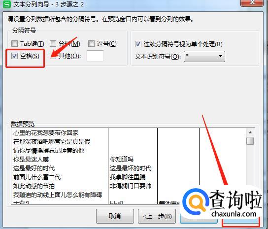 将表格中的内容以空格的方式分开,选择是要“按照空格的方式来分列”,先点击【下一步】,再勾选以“空格”形式分开,再点击【完成】即可。