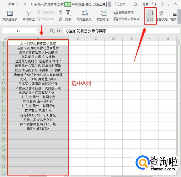 在菜单栏中找到“分列”。分列的作用是将一个单元格中的内容根据指定条件分隔成多个单独的列。鼠标点击【A】,选中“A列”。