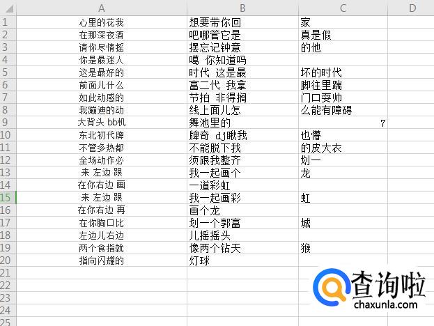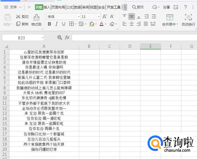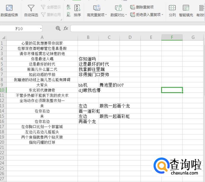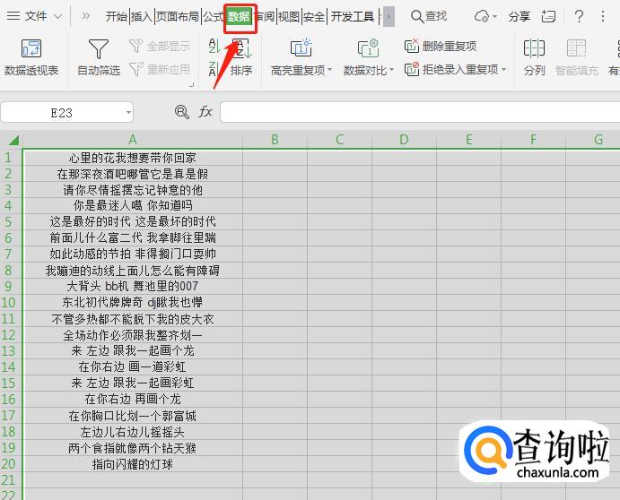 打开需要分开的数据表格,本次操作以歌词为例,全部选中文字【Ctrl+A】,点开数据下面的菜单栏。