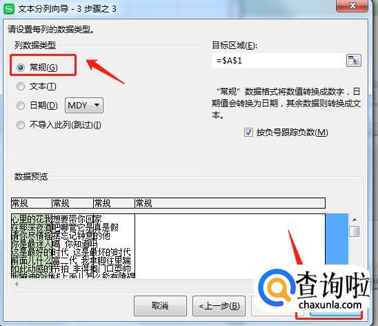 选择文字的显示格式,这一步文字都是文本格式,点击【常规】格式显示,如果内容需要特殊形式展示,在这一步就能选择其他显示形式,最后点击【完成】即可看到按刚刚设置的距离来分行的效果了。