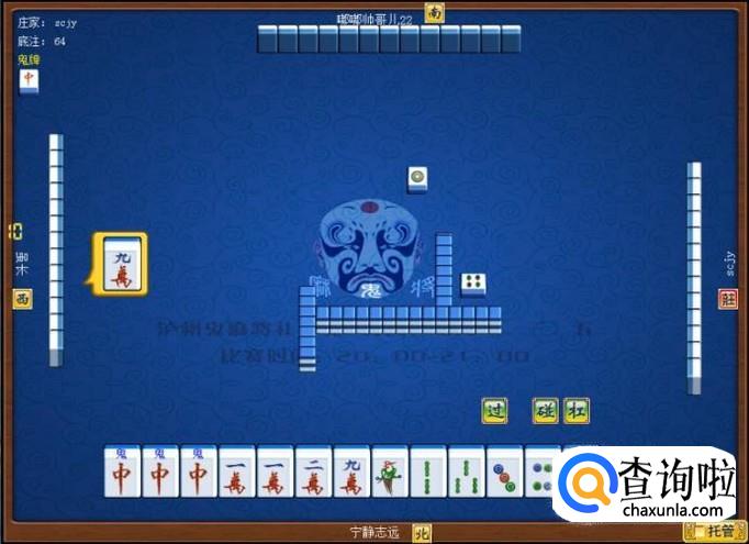 顶家摸牌,顶家打出九万。估计是顶家看到两家都打万字,所以,顶家就选择了不是万字这门牌的其他门的牌开,避免剩下的一家吃独食。这在泸州麻将中称作:“站岗”。如图所示。