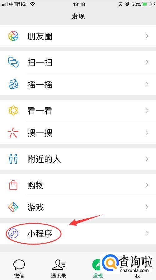 登录微信,在“发现”页找到“小程序”;