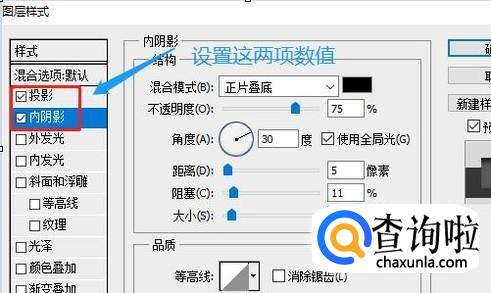 在此对话框,我们分别点击“投影”和“内阴影”这两项,也可以根据自己的实际需求设置数值,设置完以后一个水珠雏形就出现了;