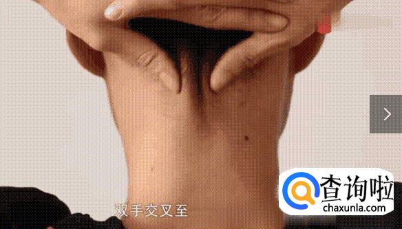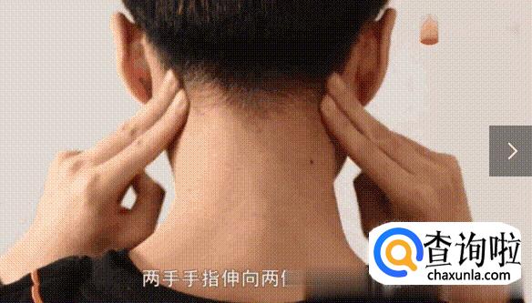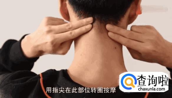 双手交叉至后枕骨处,双手拇指张开,按住枕骨下缘,由中间向两侧反复按揉。