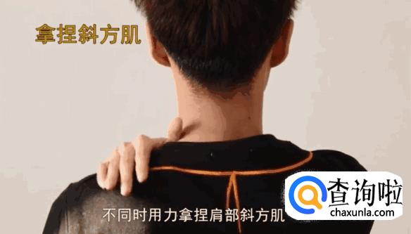 右手手掌至于左肩部斜方肌上,手指指根和掌根同时用力拿捏,肩部斜方肌,左右交替进行反复数次。