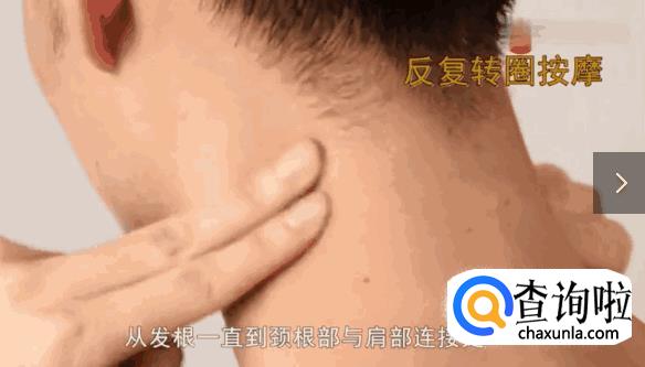 两手手指伸向两侧后颈部,手指在脖子两侧做旋转按摩,从发根一直到颈肩部及与肩部连接处反复旋转按摩。