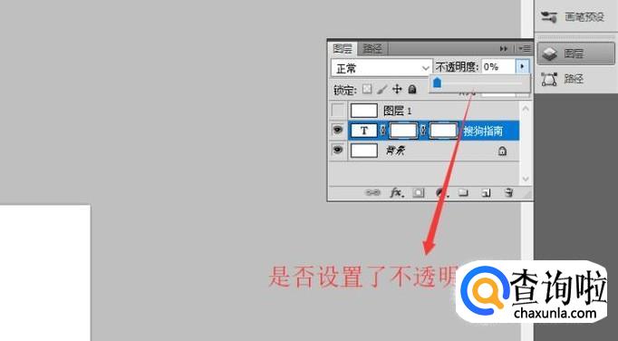 最后我们看一下文字图层是否设置了透明度,如果透明度设置成0也是看不到的,如下图所示