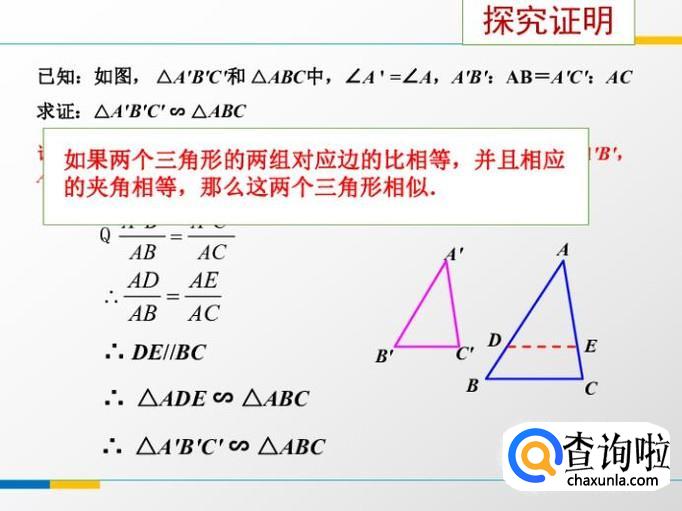 如果两个三角形的两组对应边的比相等,并且相应的夹角相等,那么这两个三角形相似