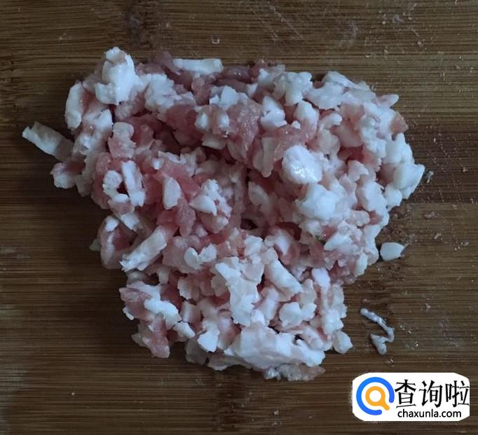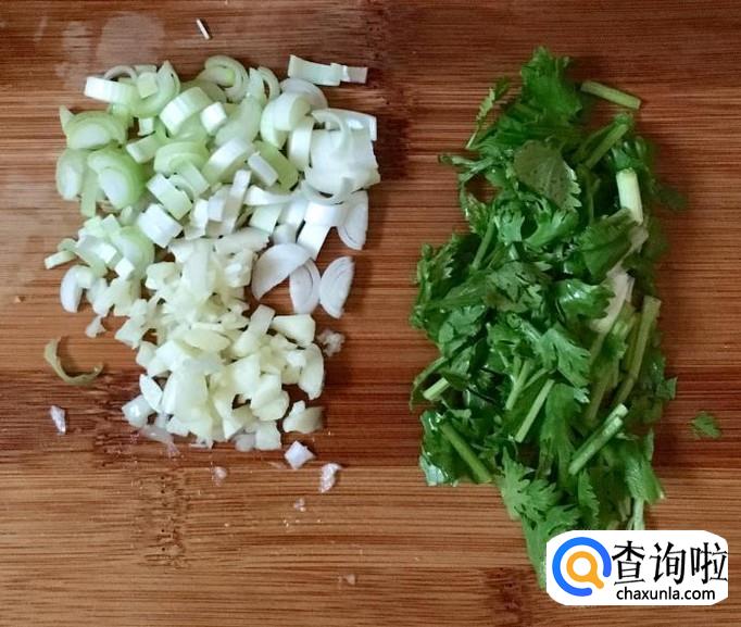 葱、蒜、香菜择洗干净后分别切成葱花、蒜末、香菜末,猪五花肉一块冲洗干净切成猪肉末备用