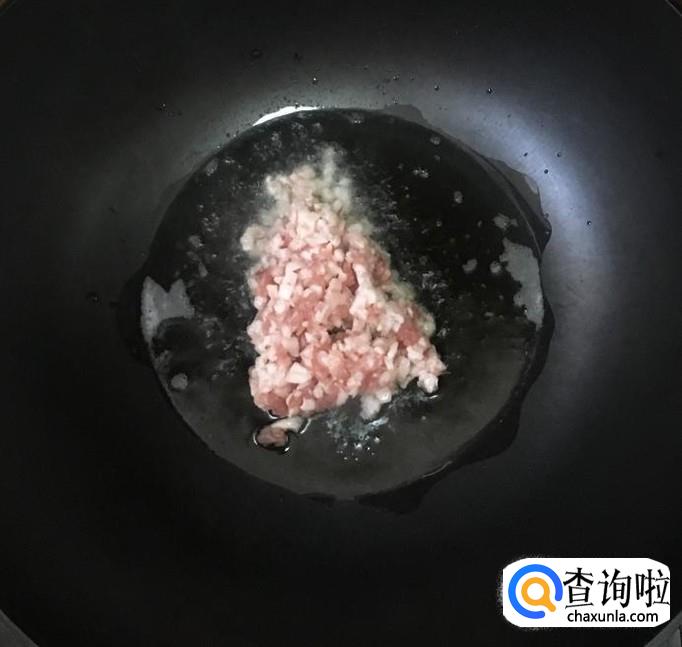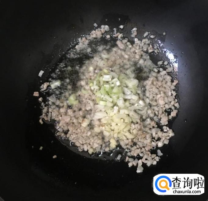 热锅加入适量的花生油放入猪肉末炒香,放入葱花、蒜末爆香,料酒烹锅