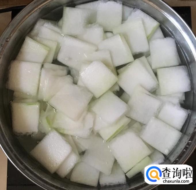 锅中加水煮沸放入冬瓜片焯水3分钟左右,捞出立刻用水反复冲洗过凉并沥干水分备用