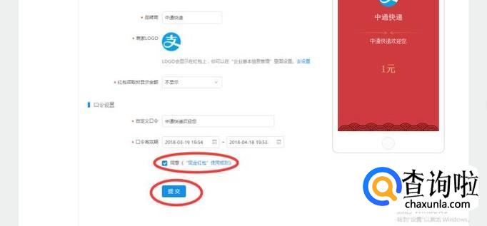 按要求输入相应内容,选择同意《现金红包使用规则》,再点击”提交“,接着点击“确认”,再确认信息后,点击“付款并发布”,如图
