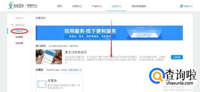 接着再点击所弹出来的界面的“运营中心”,再点击“创建活动”,将鼠标往下拉,找到“口令红包”,如图