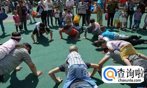 玩法:小朋友抱紧家长的脖子,背在家长的背上,家长双手着地做俯卧撑,看哪组家庭做的最多为胜。