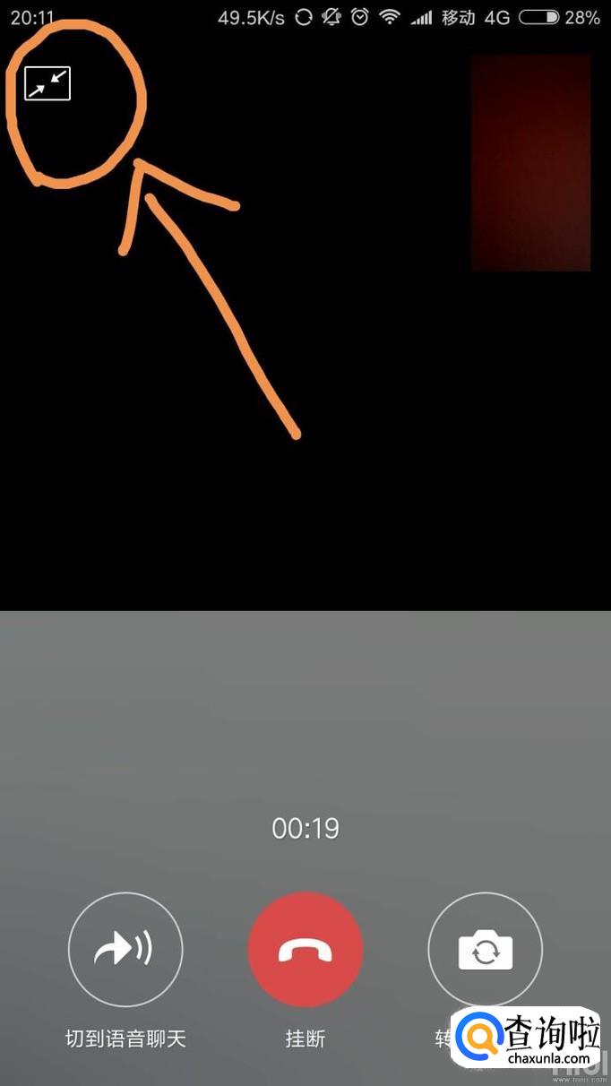 和好友开通视频后,在画面的左上角点击缩小图标。
