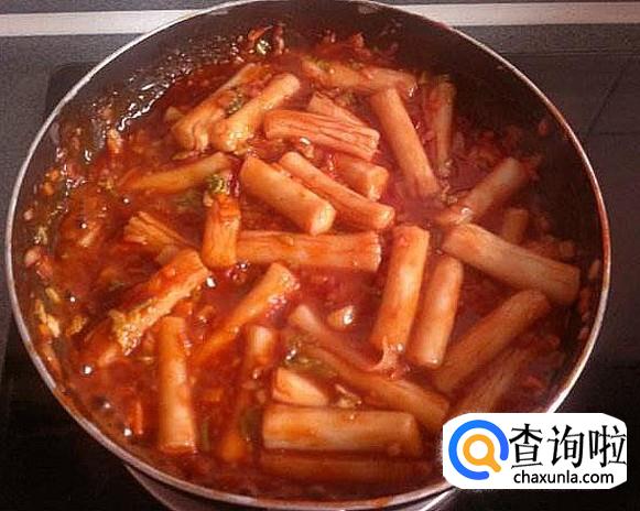 将年糕条煎制呈微焦色后,放入适量户户辣酱、5分之一听雪碧、葱花,1碗水一起炖煮。