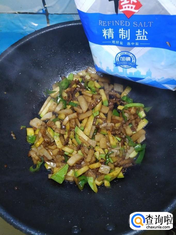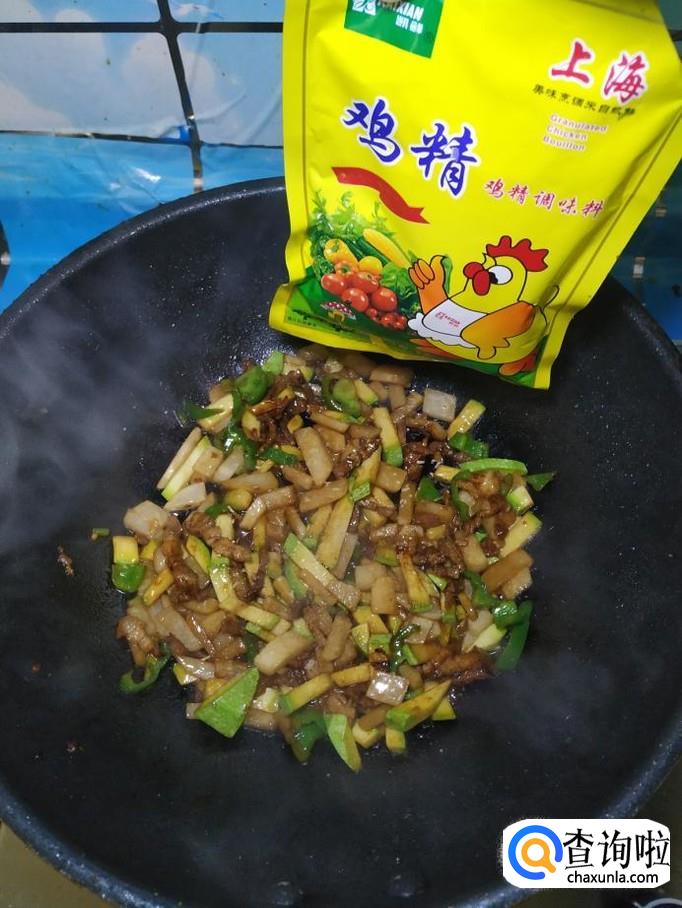 准备适量五花肉,洗净后切成肉丝,再准备适量生姜,切碎放在上面,加入适量盐,鸡精,五香粉,生抽,料酒,搅拌均匀,腌制十分钟。
