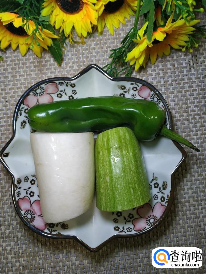准备适量青椒,西葫芦,白萝卜,把它们洗净后切成小丁,放入盘中备用。