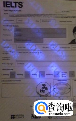 第三,荧光防伪,在暗淡处用紫光灯照射下可以看到IELTS字样的荧光字迹分布在整个成绩单内部、错落有致。下图为视频中的截图展示。