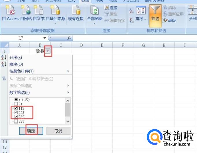 之后我们点击筛选边上的下拉箭头,弹出的界面,我们选择图示中的三个数据,然后点击确定;