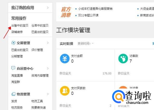 登陆自己的淘宝后台,打开卖家中心,选择“出售中的宝贝”点进去之后会到下一个界面。