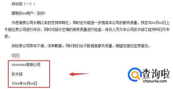 最后,我们就把我们的名字放置到我们的拜访函里面,当然了,我们也要写明时间,可以的话在我们的主题语句里面也写明时间,写清楚我们哪天去拜访,不要忘记了。