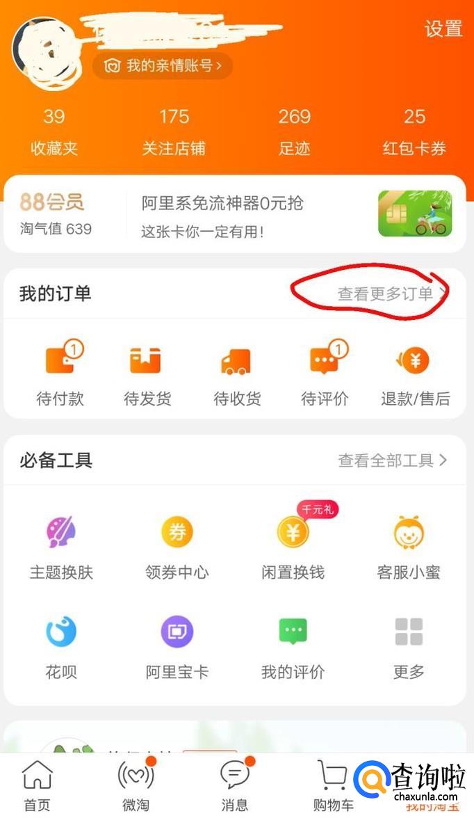 跳转到以下界面,可以看到更多订单这个选项,也就是下图划圈处。点击“查看更多订单”,跳转到订单界面。