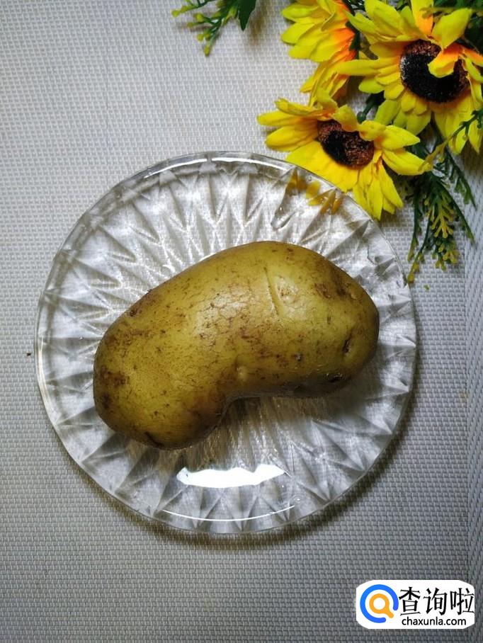 准备一个土豆,洗净后,去皮,切成片儿,洗去淀粉,放入盘中备用。注意,土豆的片儿,可以切得稍微厚一点儿,这样口感更好。