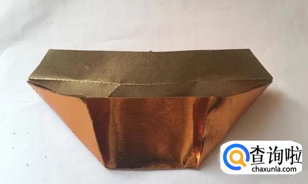 最后,捏住左右两个角,拉开金箔纸,这时中间就鼓起来了,再捏一捏两侧凹陷,整理好形状,一个金元宝就折好了。