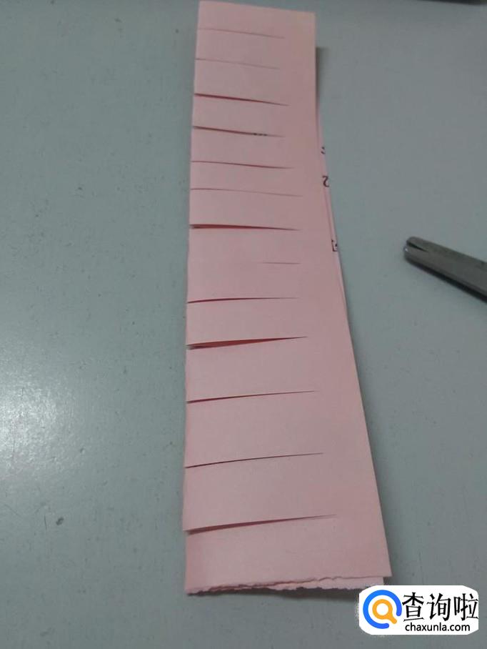 再用剪刀从彩纸上裁下两个小纸条,其中一个用剪刀在下方剪成许多细小的条状,表示灯笼穗。
