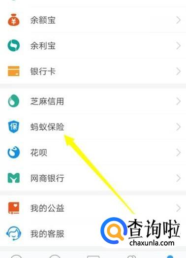 进入之后,在“我的”页面找到“蚂蚁保险”,进入下一页面,如图所示。