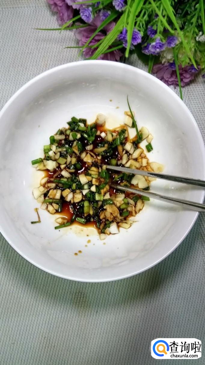 将葱,姜,蒜分别切碎后,放入碗中,放入适量盐,鸡精,五香粉,生抽,陈醋,再加入适量的生抽和辣椒油。