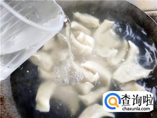 锅里的水沸腾两次之后,将一碗凉水沿着锅边倒进去,然后翻动饺子。