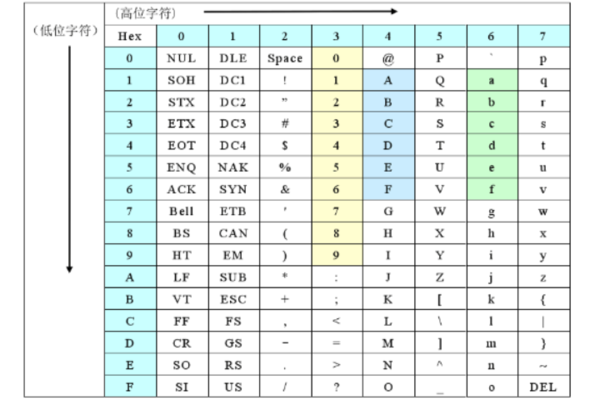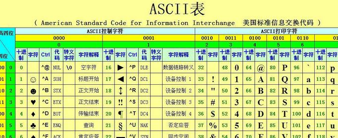 ASCII码的值从小到大为数字、大写英文字母、小写英文字母。48~57为0到9十个阿拉伯数字;65~90为26个大写英文字母;97~122号为26个小写英文字母。