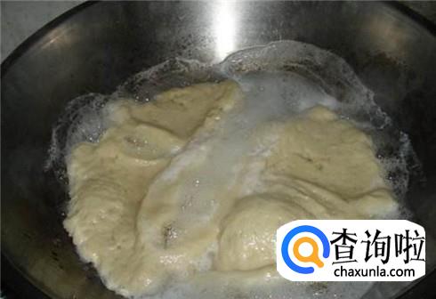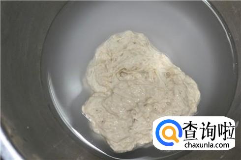 然后,我们将发酵好的面团倒入清水开始清洗,这样就是洗面筋的过程,直到面团无法溶解在清水中即可。