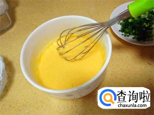 鸡蛋打进盆里,每次用一到两个鸡蛋就可以了,用筷子把鸡蛋打散。