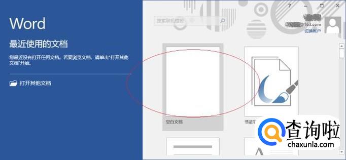 启动Word 2016文字处理应用软件,如图所示点击界面右侧新建空白文档。