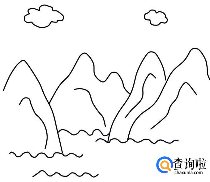 在山的上方,画两个连在一起的曲线,表示云朵。