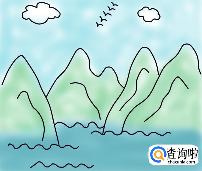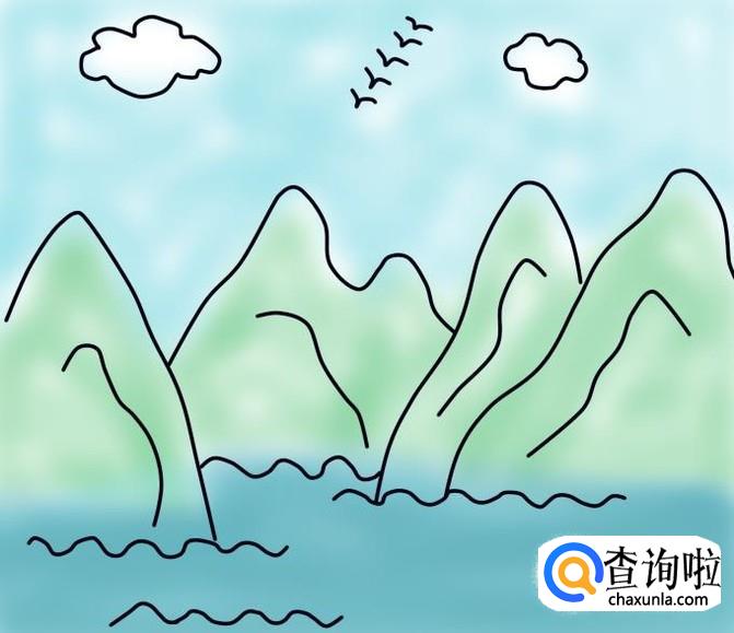 再把天空涂成浅蓝色,水面涂成深蓝色,山水风景就画完了。