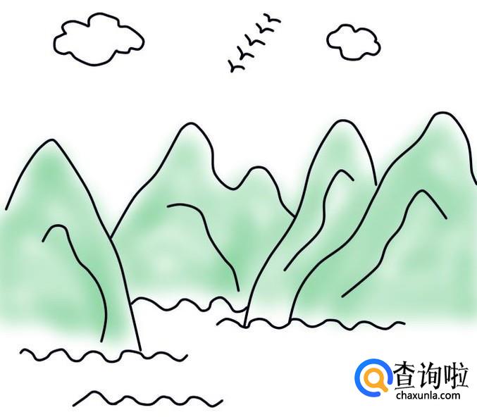 用绿色把四座山涂上颜色,不用均匀地涂,有深有浅更好看。