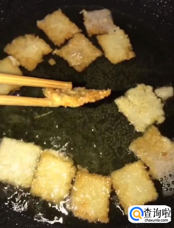 接着我们起锅烧油,油温七成热下入锅中,炸至金黄酥脆捞出
