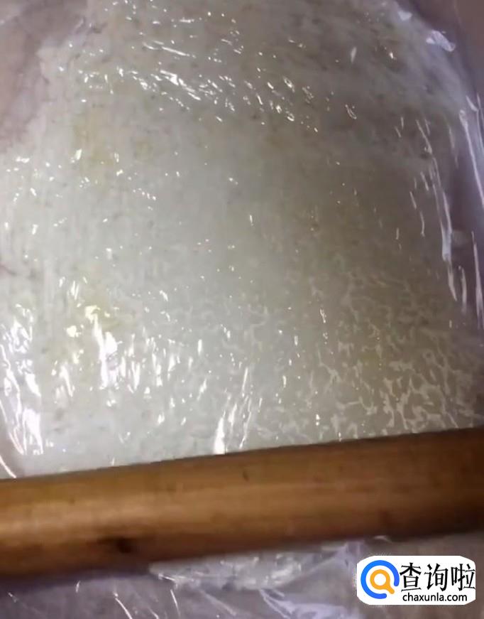 首先我们准备一些剩米饭,装入保鲜袋中,用擀面杖擀扁,擀成薄片