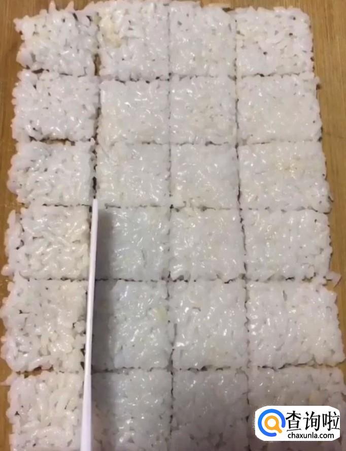然后我们用刀将擀好的米饭切成小块,如图所示