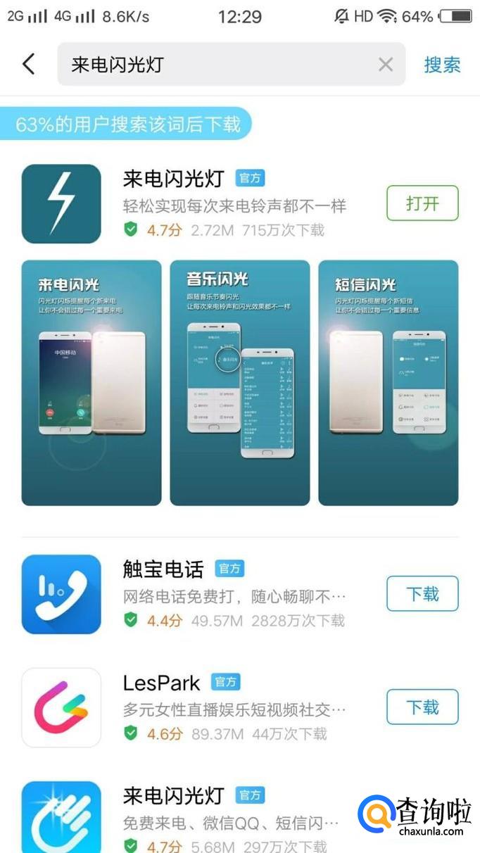 进入应用商店之后,搜索“来电闪光灯”,选择一款将其安装到手机上面,如图所示。