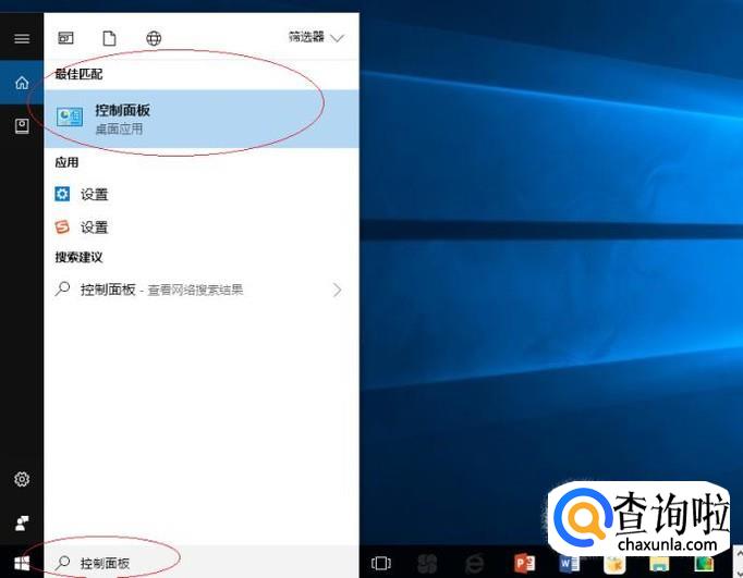 如图所示,搜索框输入"控制面板"。Cortana(小娜)显示搜索结果,点击"最佳匹配→控制面板"项。
