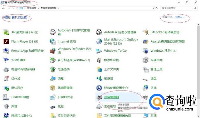如图所示,显示控制面板所有项目。点击"设备管理器"图标,用于查看和更新设备硬件设置和驱动程序软件。