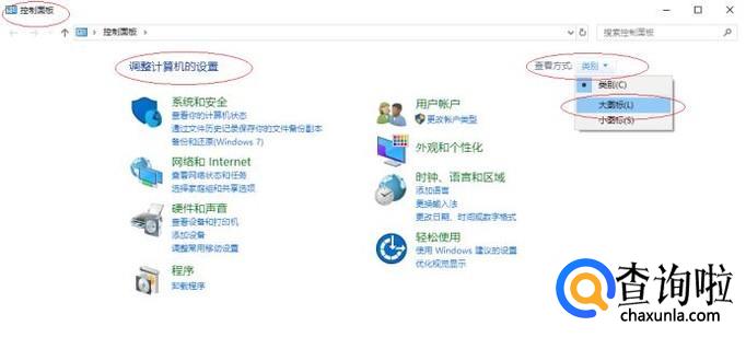 唤出"控制面板"程序窗口,如图所示。点击"查看方式"右侧向下箭头,弹出下拉列表选择"大图标"项。
