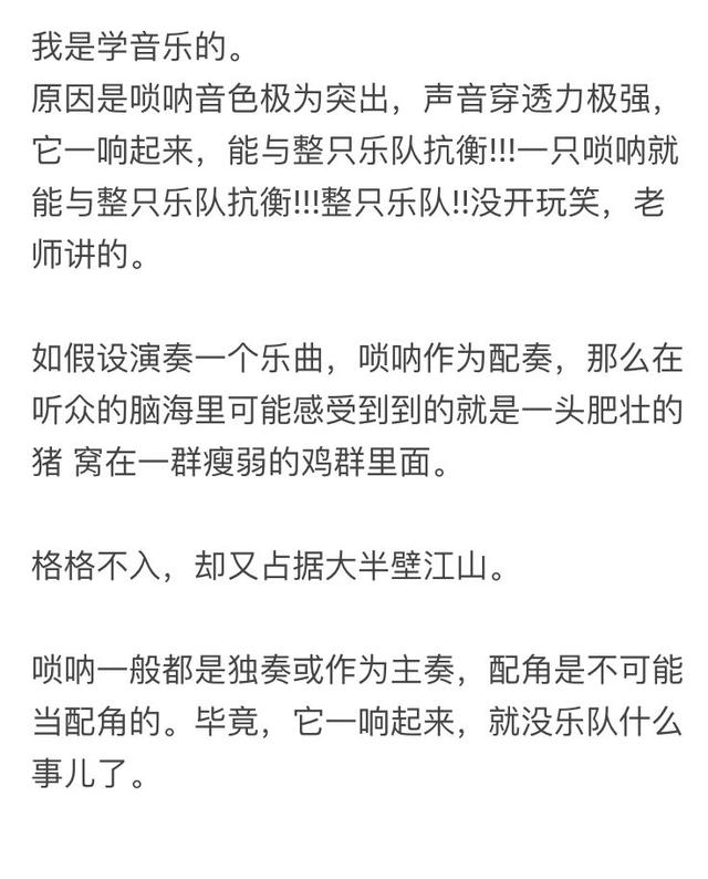 某位知乎网友说,一只唢呐就可与整支乐队抗衡,唢呐一响,百乐皆退: