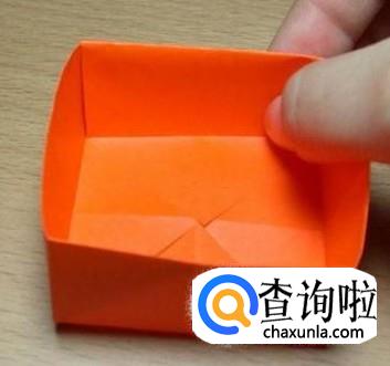 将翻折的四个角再向外翻折(角的顶点要在小正方形的边上)选择相对的两边,沿外侧两条竖着的折痕剪到与横折痕交点处,拉开,沿折痕折叠好。